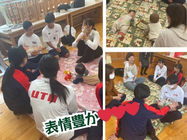 月齢3~10ヶ月の赤ちゃんは表情豊かで、やわらかく、小さな指でおもちゃを握ったり、愛らしい瞳で生徒たちを見つめたり、そのしぐさ一つ一つが可愛らしかったです。