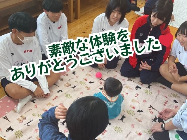 「赤ちゃんふれあい交流会」は、宇土市にある子育て支援センター「ひまわり」「緑川子ども園」「網津保育園」のお声がけのもと実現した取り組みで、今回は9組の赤ちゃんとその保護者が参加くださりました。
