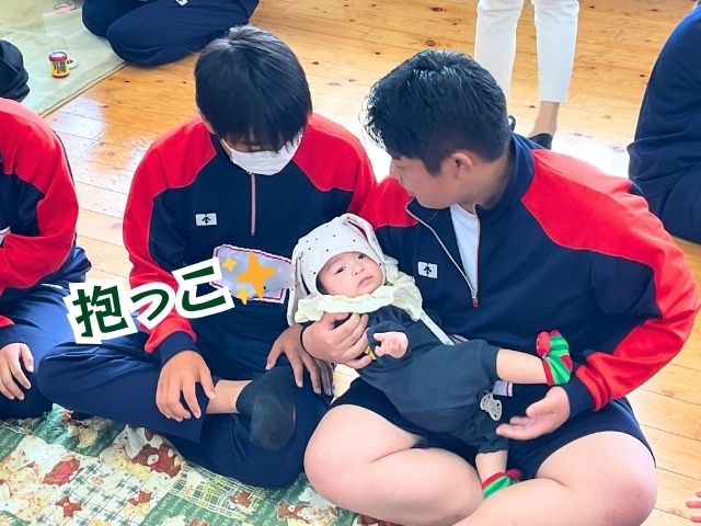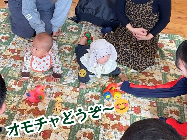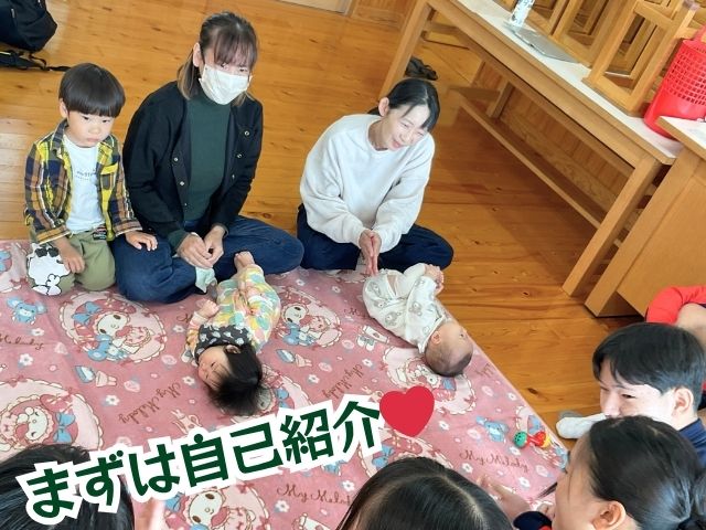 子育て支援センター「ひまわり」「緑川子ども園」「網津保育園」の先生方にサポートいただきながら、今回は10組の赤ちゃんとその保護者と交流させていただきました。