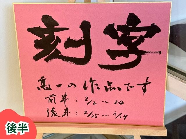 2026年2月25日(水)~3月14日(土)にかけて、1生が書道の授業で制作した刻字作品の後半分を展示しています。
