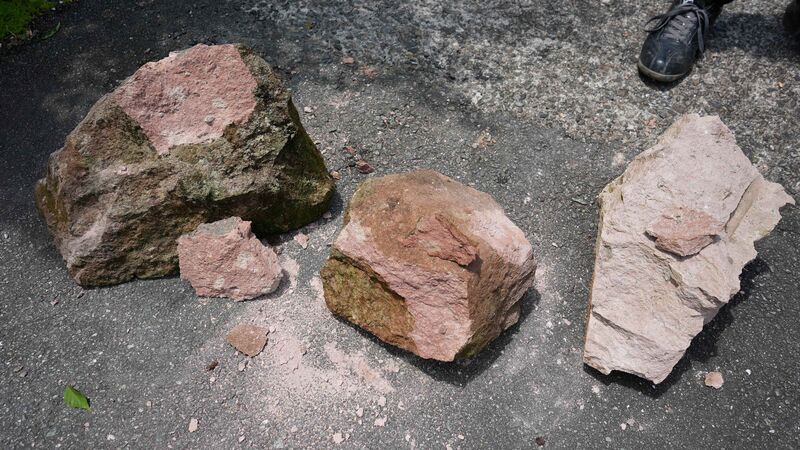 道具を用いて割られた馬門石(左・中:赤味が強い、右:うすいピンク色)