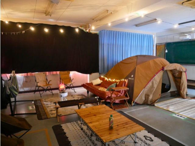 「広報うと」10月号の表紙にも選定されている、人気のグランピングを教室内で再現し、高クオリティな休憩所を実現しました!
