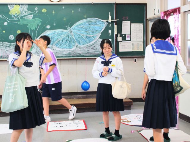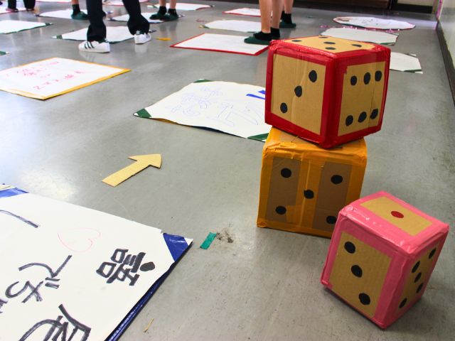 教室の床いっぱいに並んだ楽しいお題にワクワクしながら、大きなさいころを振って進む「巨大すごろく」。