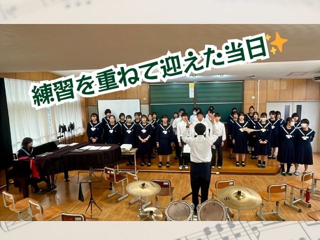 当日は宇土中3年生42名による合唱「マイバラード」、宇土中吹奏楽部3年生6名による重奏「透き通る青、ひとつぶの夏」、宇土中吹奏楽部全員の合奏で「勇気100%」を演奏しました。