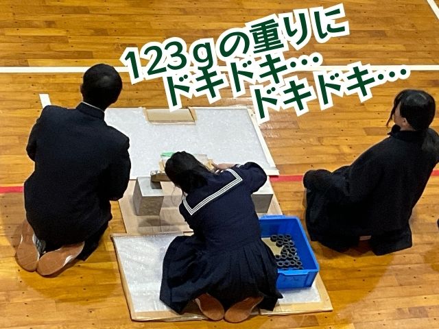 液状のりで外形・欄干・内部補強をした橋は、約123gのナット16個(合計約1.97kg)を載せられるか強度確認を行います。
