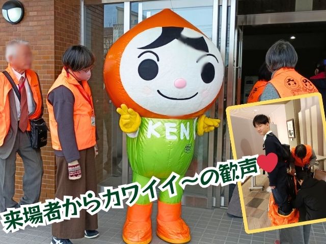 会場で「可愛い~~❤」との歓声を集めた人権擁護着ぐるみ「人権あゆみちゃん」と「人権まもるくん」も当校ボランティア委員メンバーが担当し、たくさんの来場者に手を振ってイベントのPRができました😊