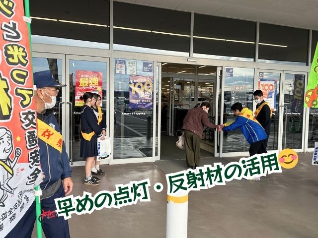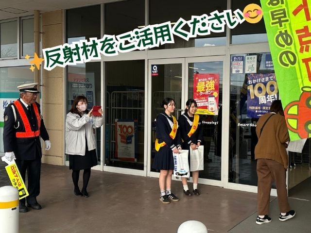 2026年2月4日(水)夕方、MrMax松橋店および宇土シティにて、宇城警察署主催の交通安全キャンペーンに本校生徒7名(高2生の富田さん、高1生の福田さん、朴さん、立花さん、稗方さん、山下さん、松﨑さん)がボランティア参加し、反射タスキの配布を行いました。