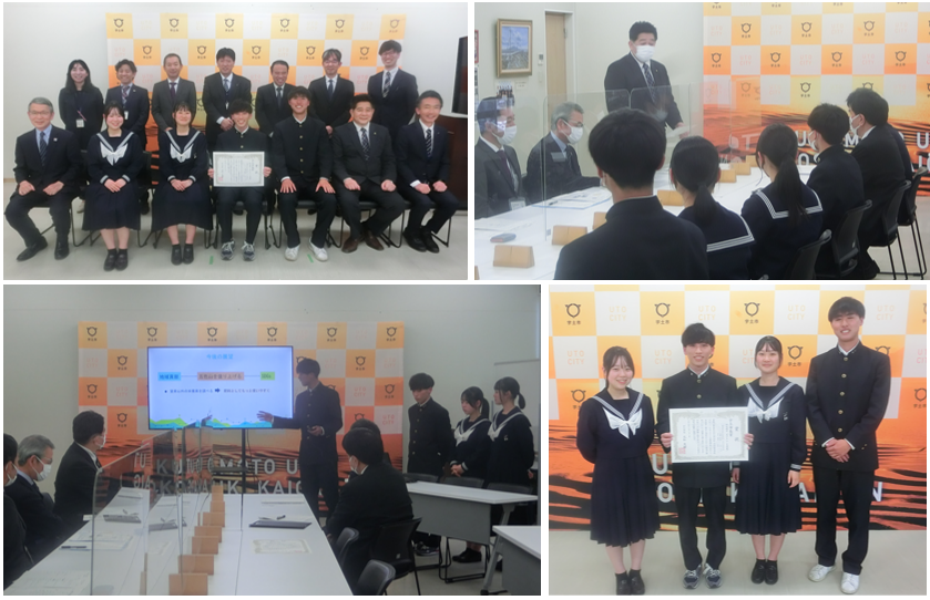 先日、宇土市民会館で開催されたロジックスーパープレゼンテーションで、宇土市にある五色山に関する研究を行っていた班が宇土市長賞を受賞しました。宇土市長賞はGS課題研究の中から宇土市に関する優れた研究に贈られます。今回は受賞の報告のために宇土市役所に表敬訪問に行ってきました。会場につくと、たくさんの職員の方に出迎えられ、記者の方もいらっしゃいました。まさに記者会見のような空気感です。会が始まると、市長を含め宇土市役所職員の方々に研究報告を行ったあと、意見交換を行いました。下の写真はその時の様子です。元松市長からもアドバイスをいただき、今後もため池に関する情報を提供していただけるということなのでさらに研究に活かしてほしいと思います。