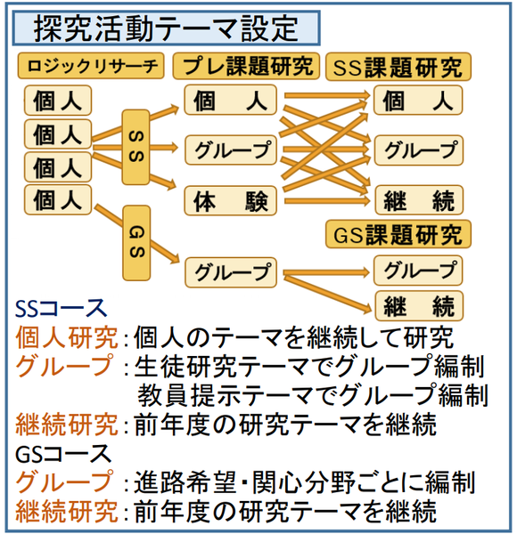 本校では、高校1年「ロジックプログラム」で、ロジックリサーチとプレ課題研究の2回、高校2年以降、「SS課題研究/GS課題研究」の1回、合計3回のテーマ設定を全員が経験します。